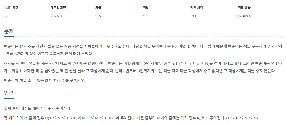 책의 범위 a~b에서 b를 기준으로 우선 오름차순 정렬 하면, 어짜피 최고로 빌릴수 있는 숫자는 b까지 입니다.