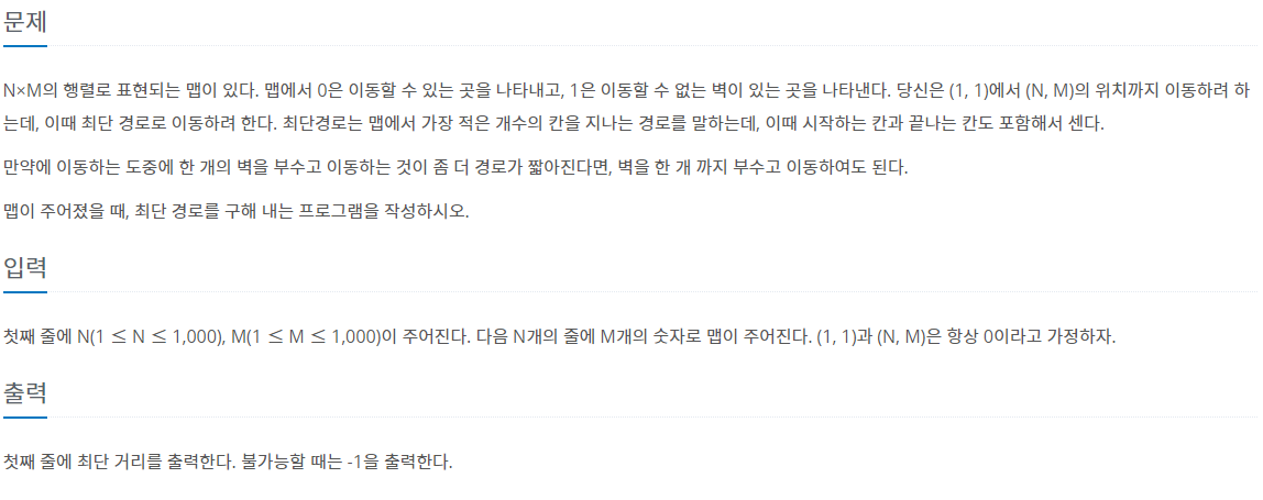 벽 부수는 것을 처음에 너무 간단하게만 생각했다가 여러번 틀린 문제입니다.