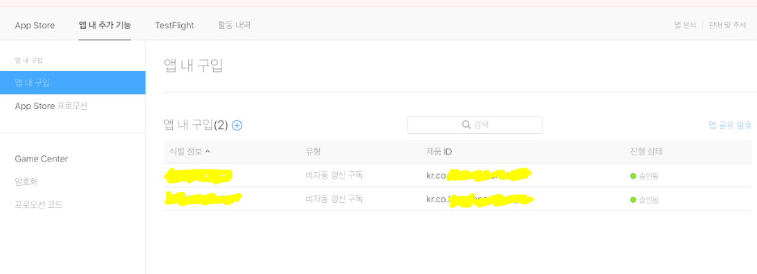우선 위 사진의 앱 내 구입 옆에 + 버튼으로 상품을 추가해봅니다. 그러면 아래의 그림처럼 나옵니다.