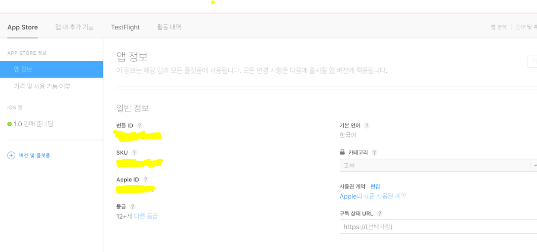 위에 billing.fovea.cc에서도 설명했듯이 아래 [계약] 부분을 완성해야 위 캡처처럼 보여, 구독 상품을 생성할 수 있고 구독 상품을 생성해야 iOS Subscription Status URL(아래 캡처의 구독 상태 URL)을 작성할 수 있습니다.