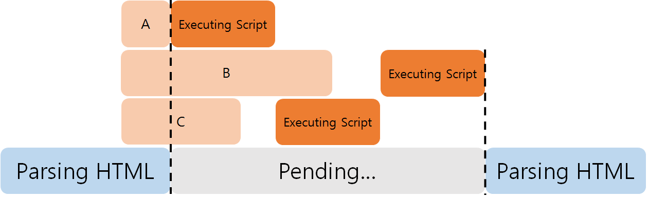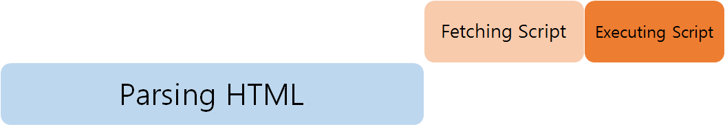 1. 속성 없을때 script를 만나면 불러오고 실행까지 시킨 후에 나머지 작업을 합니다. 위에 보이는 것처럼 head 안에 있다면 HTML 파싱이 끝나기 전에 실행해버리고, 만약 script 파일이 크다면 그만큼 로딩이 오래걸립니다.(요즘은 워낙 사양이 좋아서 크게 상관은 없어보입니다만 미세한 차이라도...)