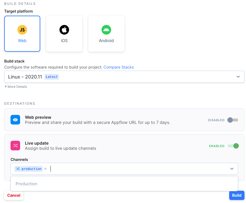 Live update 오른쪽의 toggle바를 enabled로 바꾸면 빌드가 끝남과 동시에 배포가 됩니다.