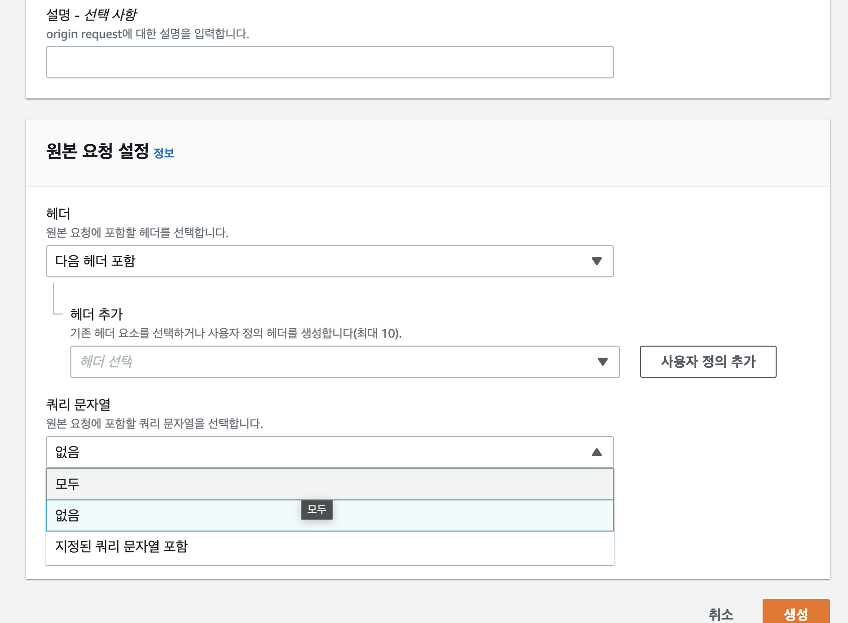 CloudFront > 배포 > 동작 편집 에서 정책 생성을 통해 필요한 헤더를 직접 세팅해줄 수 있습니다.